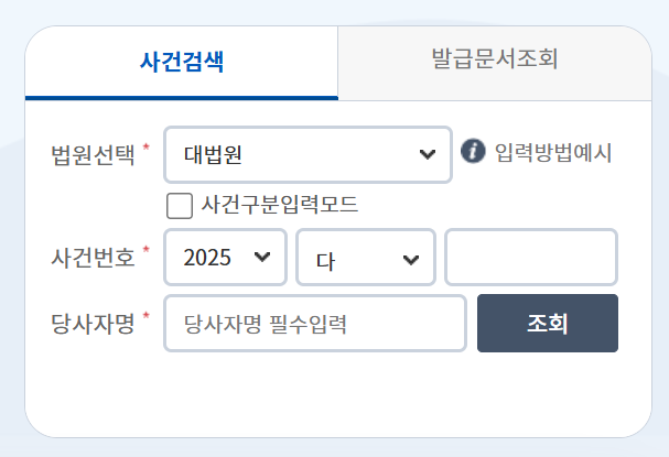 사건번호를 모를 경우에도 성명·주민번호로 조회 가능합니다.