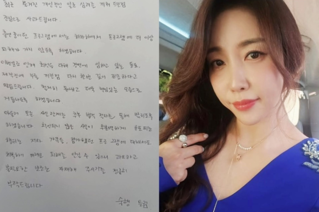 숙행은 30일 SNS에 자필 입장문을 올려 “최근 불거진 개인적인 일로 심려를 끼쳐 드려 진심으로 사과드린다”며 출연 중이던 프로그램에서 하차하겠다고 밝혔다.