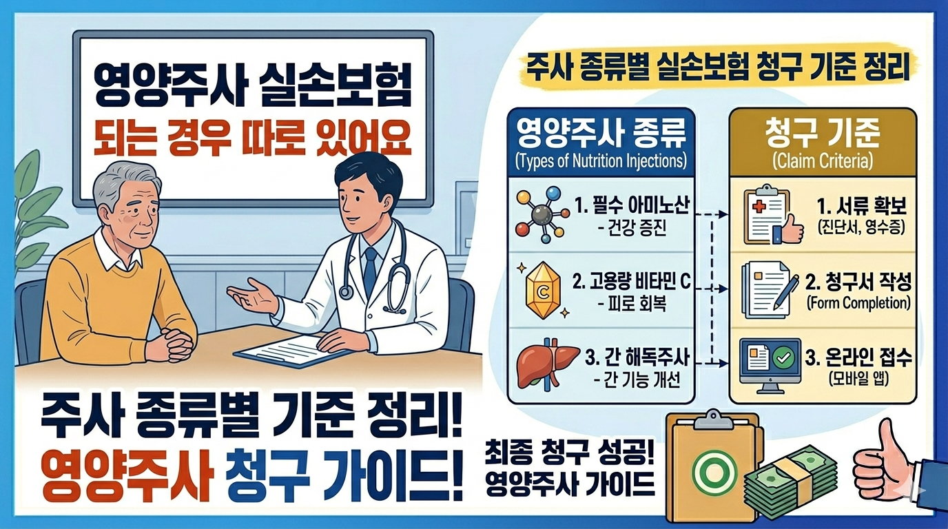 저도 처음엔 "영양주사는 무조건 안 되는 줄" 알았어요. 근데 병명이 붙냐 안 붙냐가 전부였어요. 같은 주사인데 "피로회복"으로 맞으면 거절, "비타민 결핍증"으로 진단받고 맞으면 지급이 되는 구조예요. 맞기 전에 의사 선생님한테 "진단명 기재해줄 수 있냐"고 물어보는 게 제일 현실적인 방법이에요.