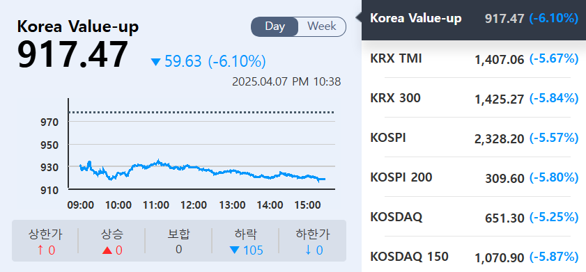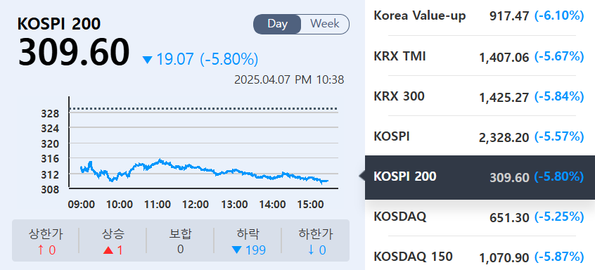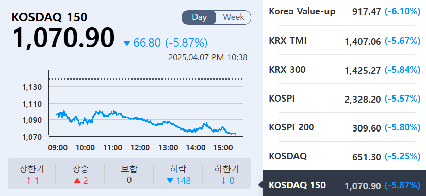 2025년 4월 7일(15:45 기준), KOSPI와 KOSDAQ 모두 5% 이상 급락하며